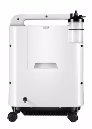 Weight is 25.5 kg. This is in the heavy end of the 10 LPM class — the Philips EverFlo 10 is 13.6 kg (significantly lighter due to the newer PSA chassis design), and the Nidek Nuvo 10 is around 24 kg. 25.5 kg means two-person moves between rooms and tricky staircase navigation. For a fixed bedroom or sick-room installation this is a one-time setup issue; for a machine that needs to move with a family member across rooms or to a relative’s home during travel, 25.5 kg is a friction point.